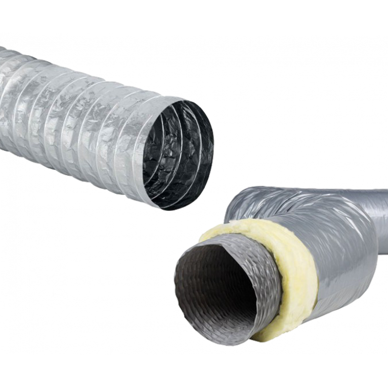 Гибкие неизолированные воздуховоды серии NVA изготавливаются из алюминиевой фольги, ламинированной полимерной лентой, со спиральным каркасом из стальной проволоки между слоями.